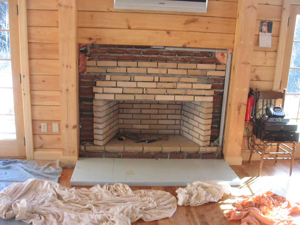 With better light, and the remainder of the tent removed, I took some better pictures of the new chimney (and of Bob's construction mess, which I am sure he will clean up once he's done--but yuck!). Today, after removing the tent around the bottom part of the chimney, he cut out the floor in way of the hearth inside, and poured a small slab to support the weight of the hearth. Earlier in the process, he had done some framing work beneath, so it was a straightforward matter today. This also revealed, for the first time, the inside of the firebox, which had been hiding behind the nice blue styrofoam for so many weeks. Even with the rough--and to be unseen--brickwork, it looked so much better already. |