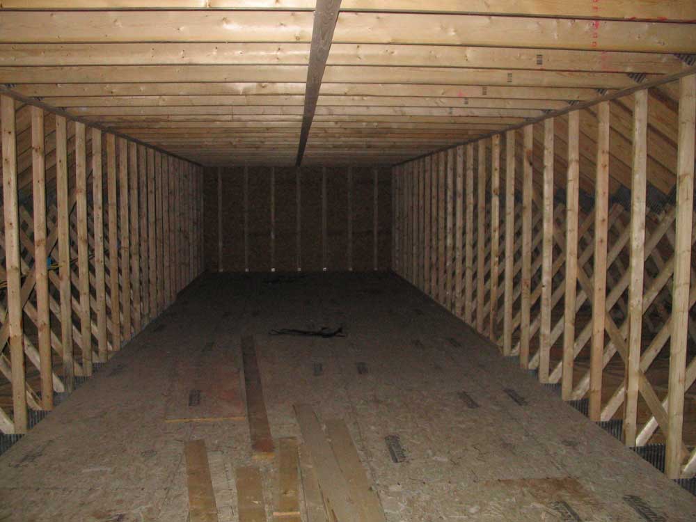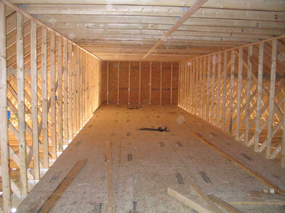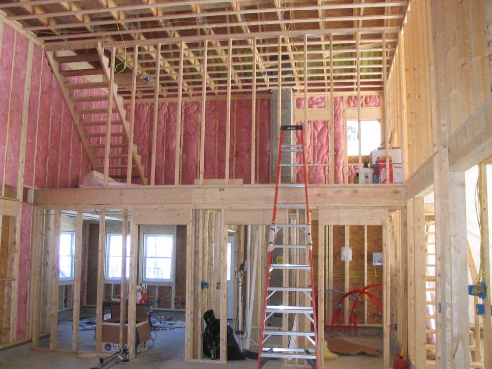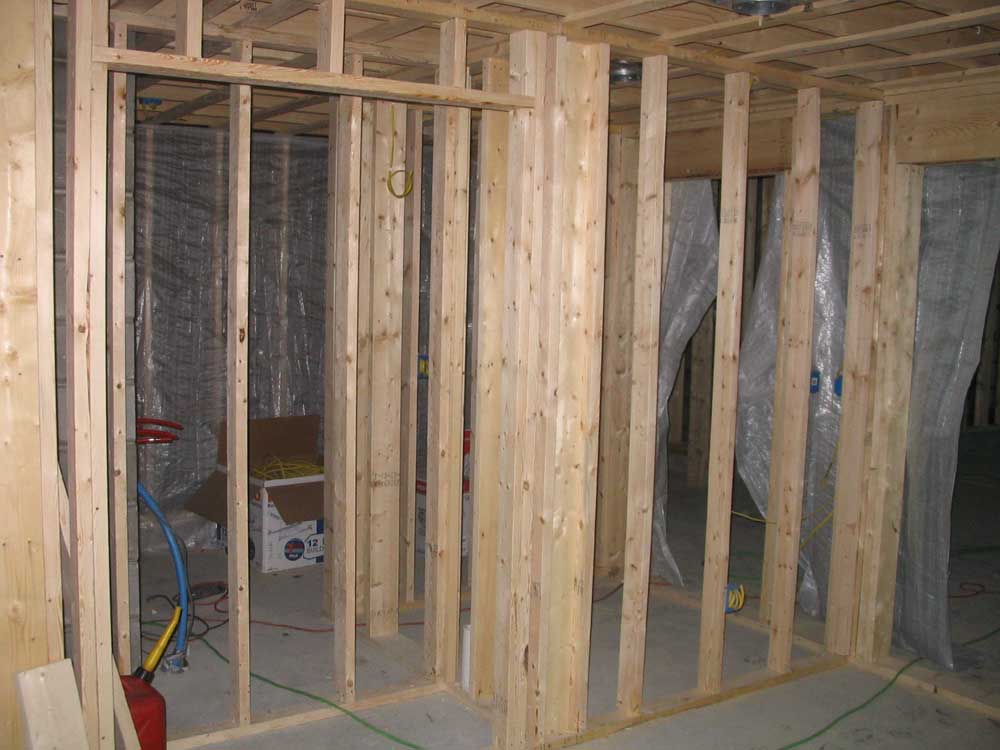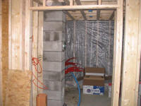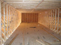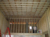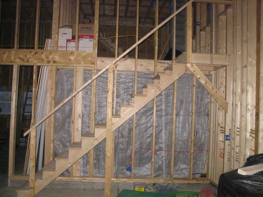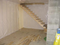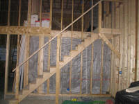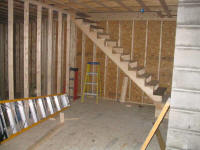 final framed wall facing the woodshop. Stairs, one